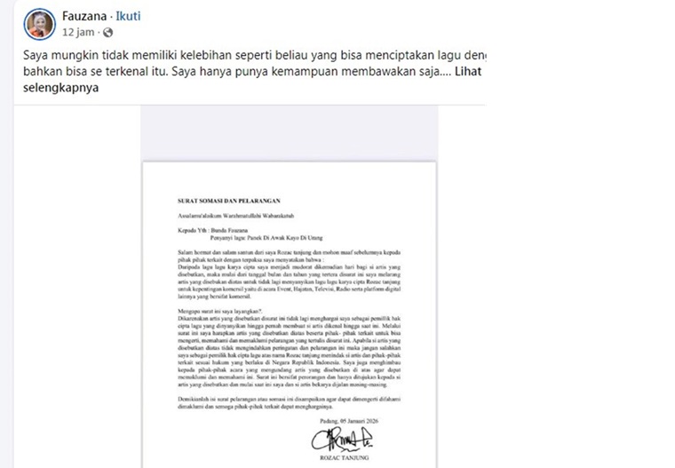 Kasus somasi tersebut diunggah langsung oleh Fauzana di akun facebook miliknya, Senin (5/1/2026). Adalah Rozac Tanjung, pencipta lagu ‘Panek di Awak Kayo di Urang’, yang mensomasi artis Minang bersuara merdu tersebut. Menurut Rozac Tanjung dalam surat somasinya, si artis (Fauzana) tidak lagi menghargainya sebagai pemilik hak cipta lagu yang dinyanyikan hingga pernah membuat artis tersebut terkenal hingga saat ini.